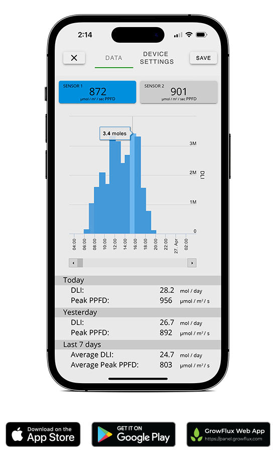 Precision PAR® monitors real time and historic PAR and DLI levels. Data is available on any device with the GrowFlux App or through the browser based web app. Easy data export within app eliminates manual data collection, and the GrowFlux API connects data to any application or system in real time.